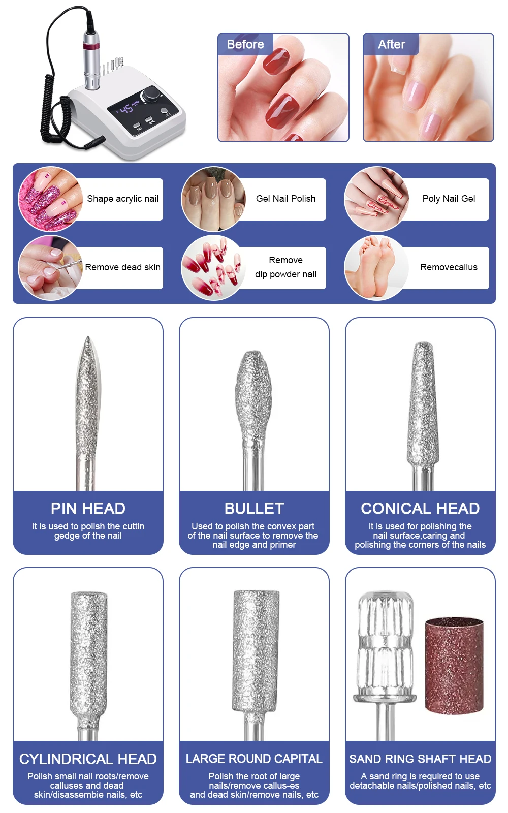 【 Multifunctional 】: The acrylic nail drill can be used for grinding, cutting, polishing, acrylic powder, carving and removing gel nails, cuticles and dead skin Does not hurt hands and nails.