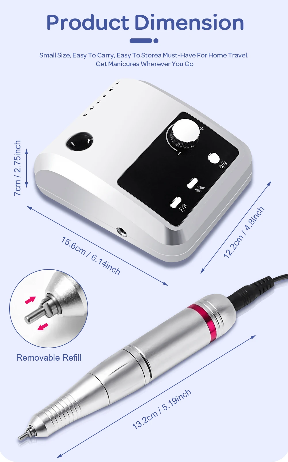 Note:Press and hold the power button for 2-3 seconds to turn on, then short press the power button to start or stop the nail polisher.