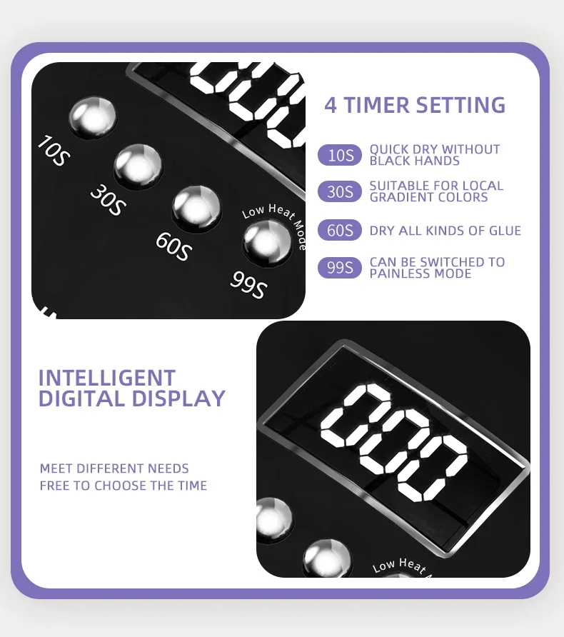 【4 Times Setting】 - 280W LED nail lamp Has 4 Timer Settings: 10s, 30s, 60s, 99s low heat mode, You Can Choose and Check the Exact Time According to your Request. dry Simulated Sunlight Nails are not black Hands, do not hurt eyes and skin. It can dry all types of frost.