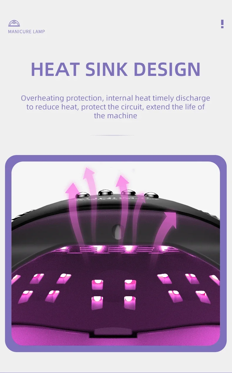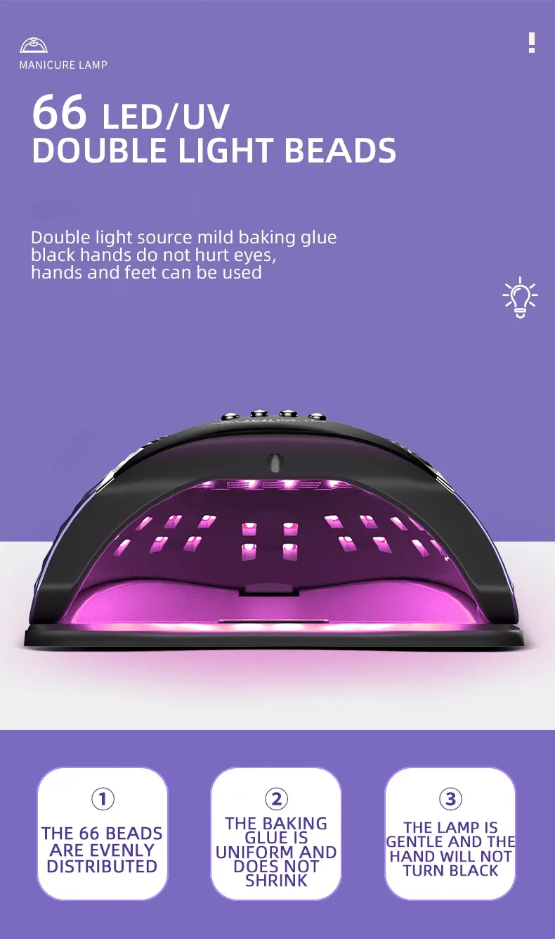 【 280W VU Nail Lamp】 This 280W uv gel nail light is designed with 66 beads lights super power with intelligent painless treatment design and quick drying. LED UV nail lamp with integrated smart temperature control chip to prevent overheating, shorten curing time, dry quickly without any pain, for fast and perfect nail experience.